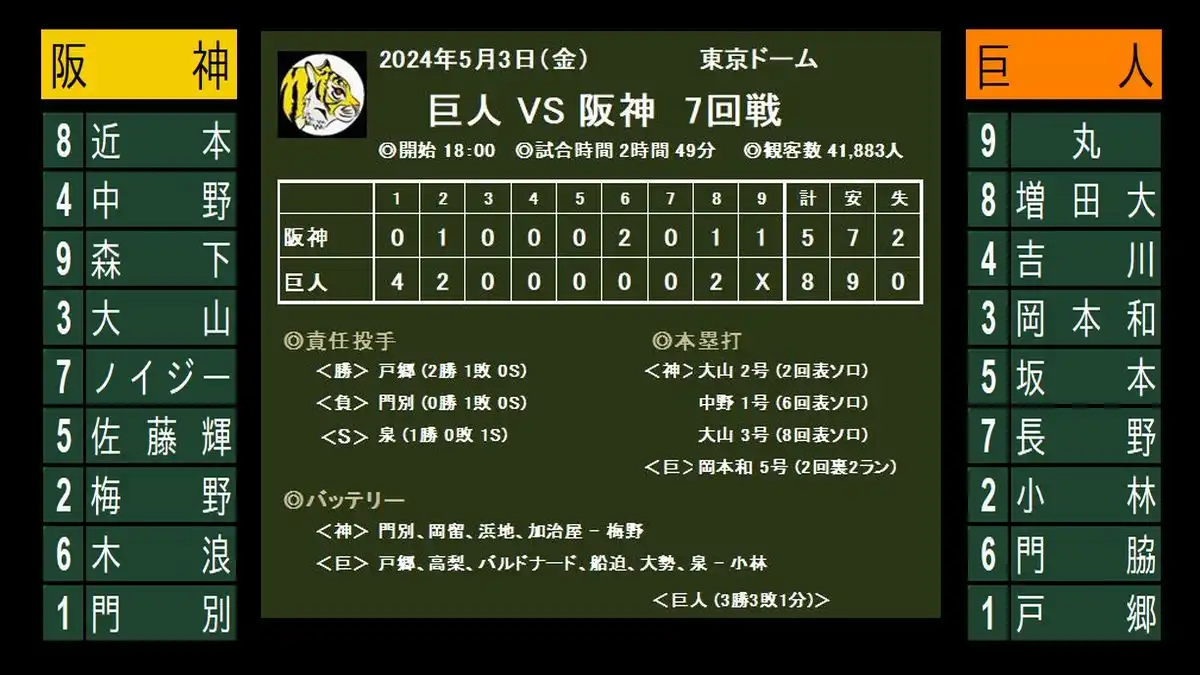 巨人 8-5 阪神 (7安打)