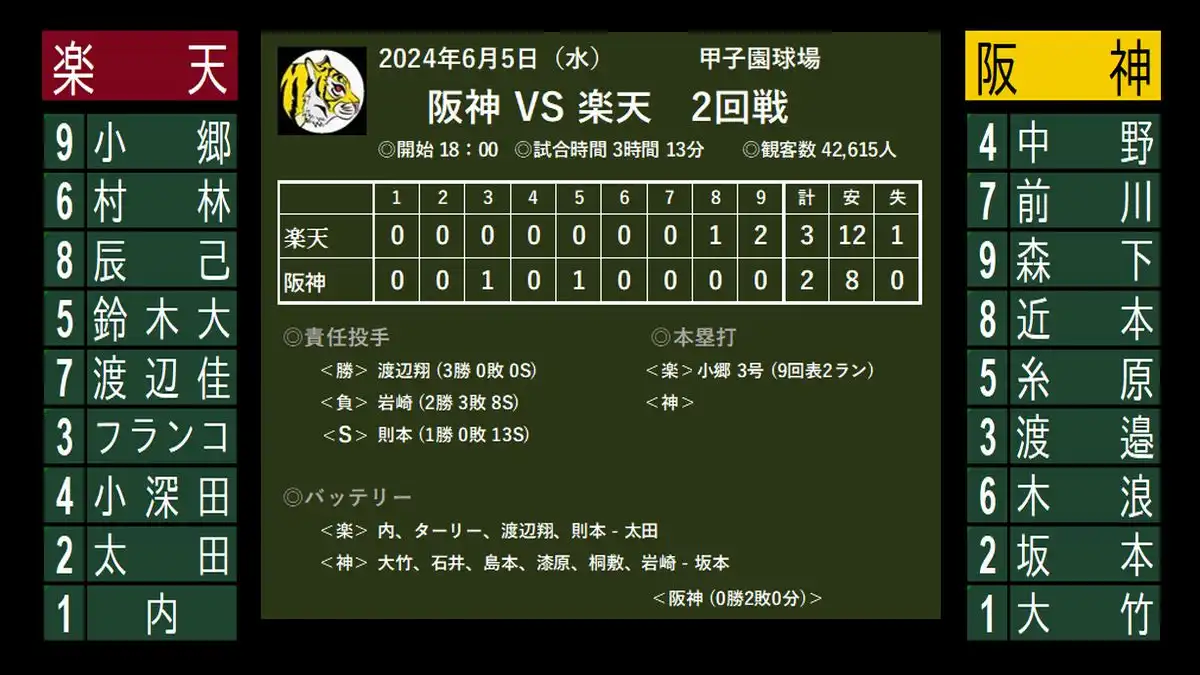 阪神 2-3 楽天 (8安打)