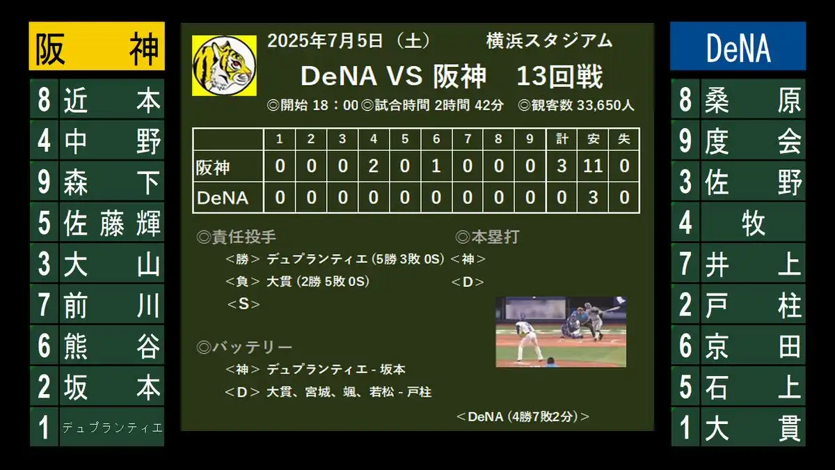 DeNA 0-3 阪神 (11安打)