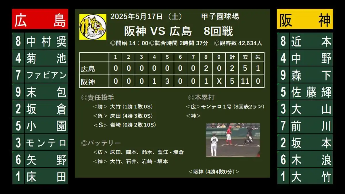阪神 5-2 広島 (11安打)