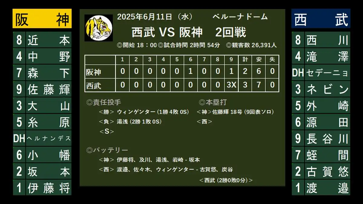 西武 3-2 阪神 (6安打)