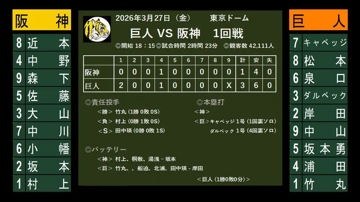 藤川阪神は2年連続” 開幕戦勝利 ”ならず。