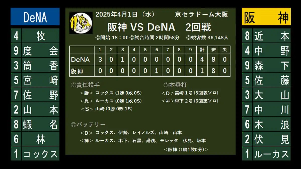 阪神 1-4 DeNA (8安打)