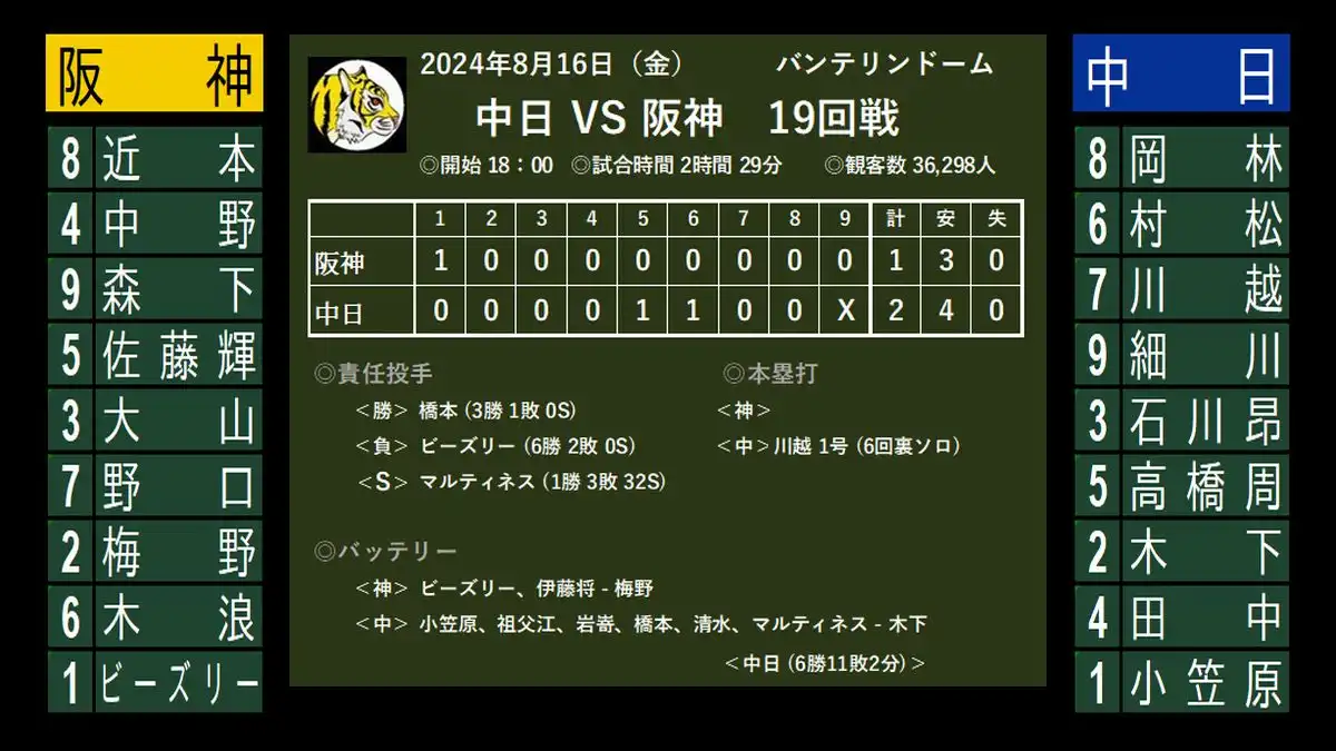 中日 3-2 阪神 (5安打) ” 投手王国 ”をさらに強固なものにする為に、待ってたよ~。 ”高橋遥人” が帰ってきました。内容は6回81球、4安打2失点。見た印象は良かった時の ”7割くらい” の感じ。ストライクとボールがはっきりしてい...