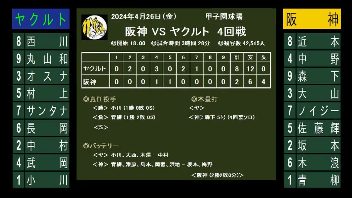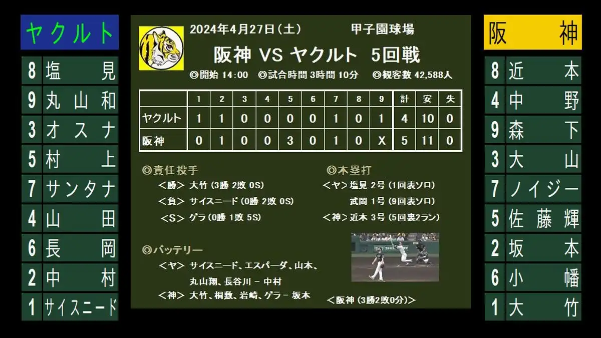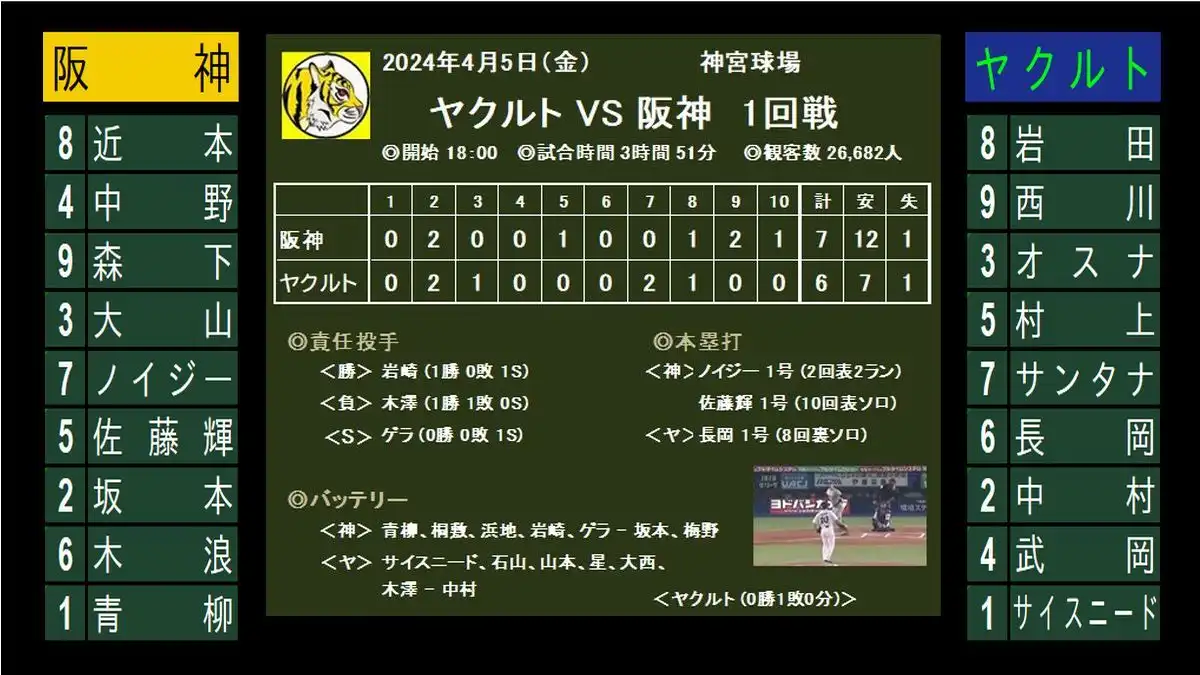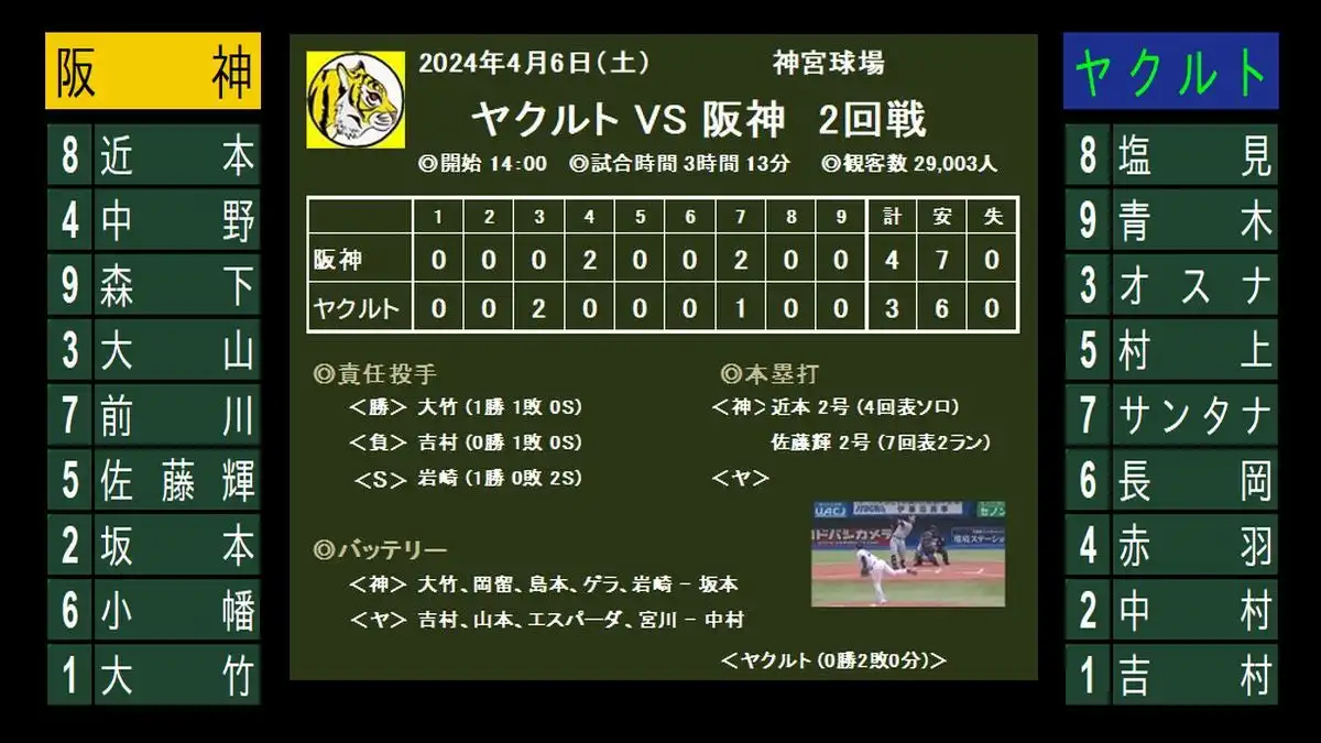 阪神 5-4 ヤクルト (11安打) *小幡、スタメン起用に応えて2安打1打点*大竹、尻上がりに調子を上げて3勝目 昨日は連勝が止まっただけでなく、" 嫌な負け方 "だったので、 ”今日の逆転勝利は大きい~” の一言。これで3・4月の勝ち越...