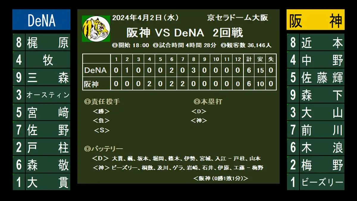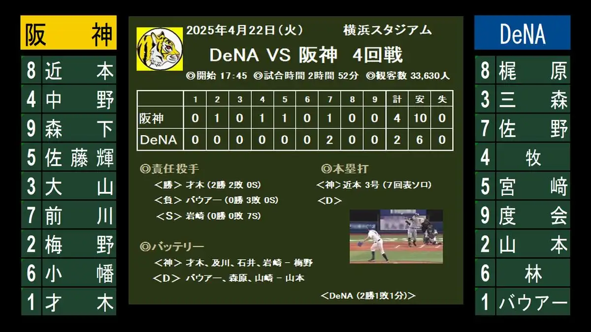 DeNA 2-3 阪神 (9安打) *島本、サヨナラ負けのピンチを防ぎ初勝利*岩崎、最後のストレートには痺れた!8S 序盤は圧倒的に優勢だった。しかし、点が取れない間に接戦になり、最後はどちらが勝ってもおかしくなかった。まぁ、 ”勝てて良か...