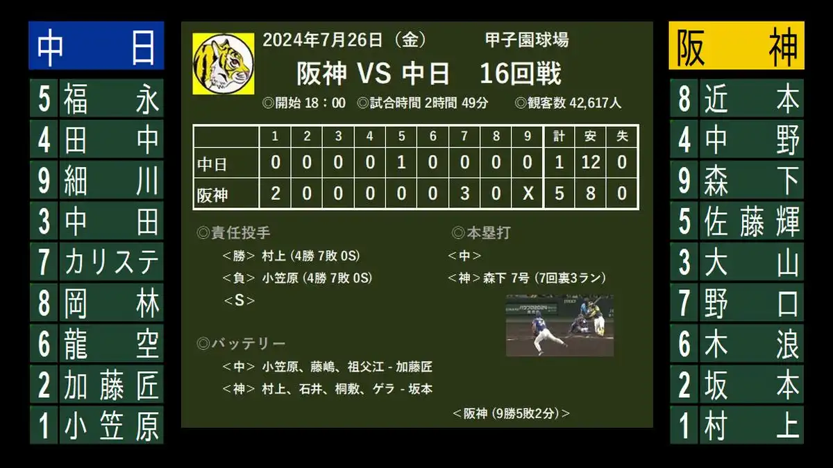 阪神 9-6 巨人 (14安打) *及川、今季初勝利と打点付きのプロ初安打*中野、1点差を突き放す貴重なタイムリー ” 首位攻防戦 ”の第二ラウンドは大味な試合となったが、終始先手を取った阪神が逃げ切りカード2連勝を飾りました。 好調と言わ...