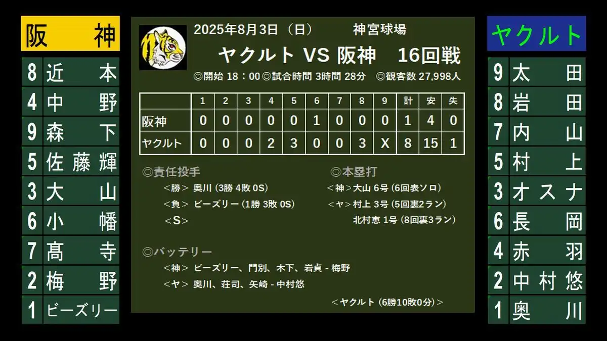 ヤクルト 3-2 阪神 (7安打) 青柳が先発して阪神打線に対峙するのは新鮮だった。青柳は緊張してた~(^^)。 佐藤輝は” 40本塁打 ”にリーチ。あの打球でスタンドインだから神宮は怖い。甲子園ならフェン直か?くらいかな。 今日は正直、 ...