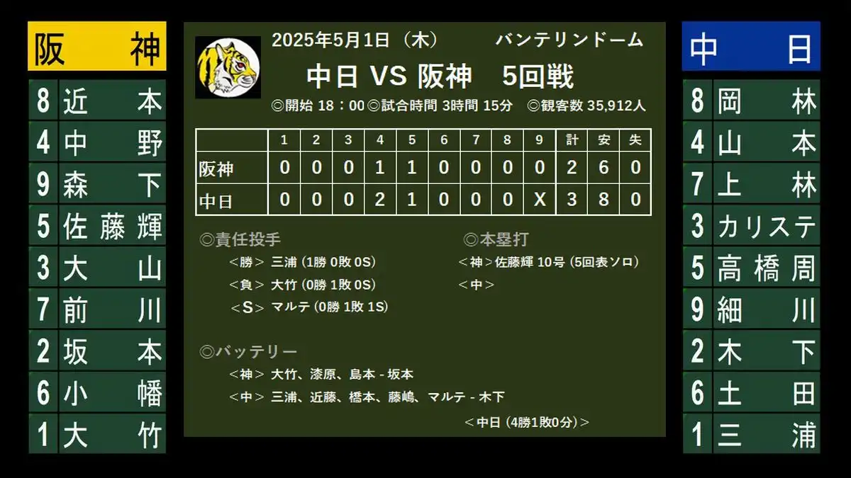 中日 3-2 阪神 (6安打) 今日も” 1点差負け ”。4連敗中で三度目。かたや4連勝した首位の巨人は三度の、 ”1点差勝ち” 真逆の結果に驚くばかり・・・(^^;。投手を多く使って勝てなかったのは痛い。 このシリーズ、中日は阪神に在籍し...