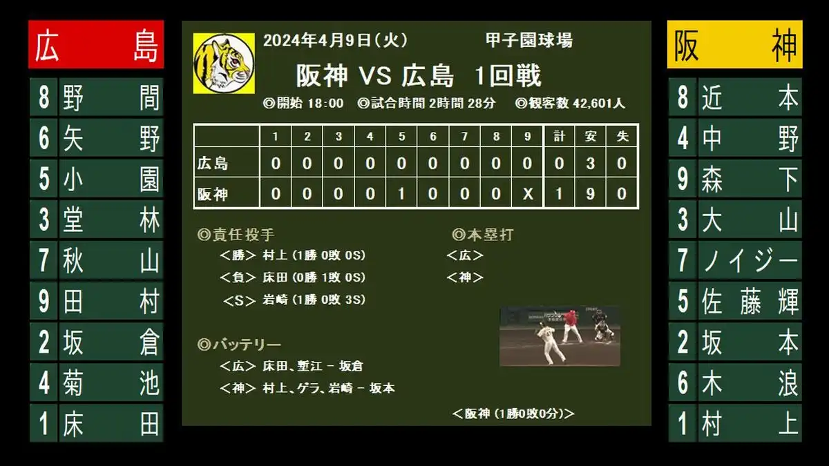 広島戦 (2024) ☆(4/9) 甲子園球場開幕戦! 阪神 1-0 広島 (9安打) *近本、勝負強さを見せて決勝タイムリー*ゲラ、岩崎の鉄壁投手リレー 超満員の観客の前で1点差の逃げ切り勝利。勝率も5割復帰しました。 試合時間の2時間28分が物語っている通り両軍の投手がテンポ良く投球して試合... 2024.04.09 広島戦 (2024)★2024年